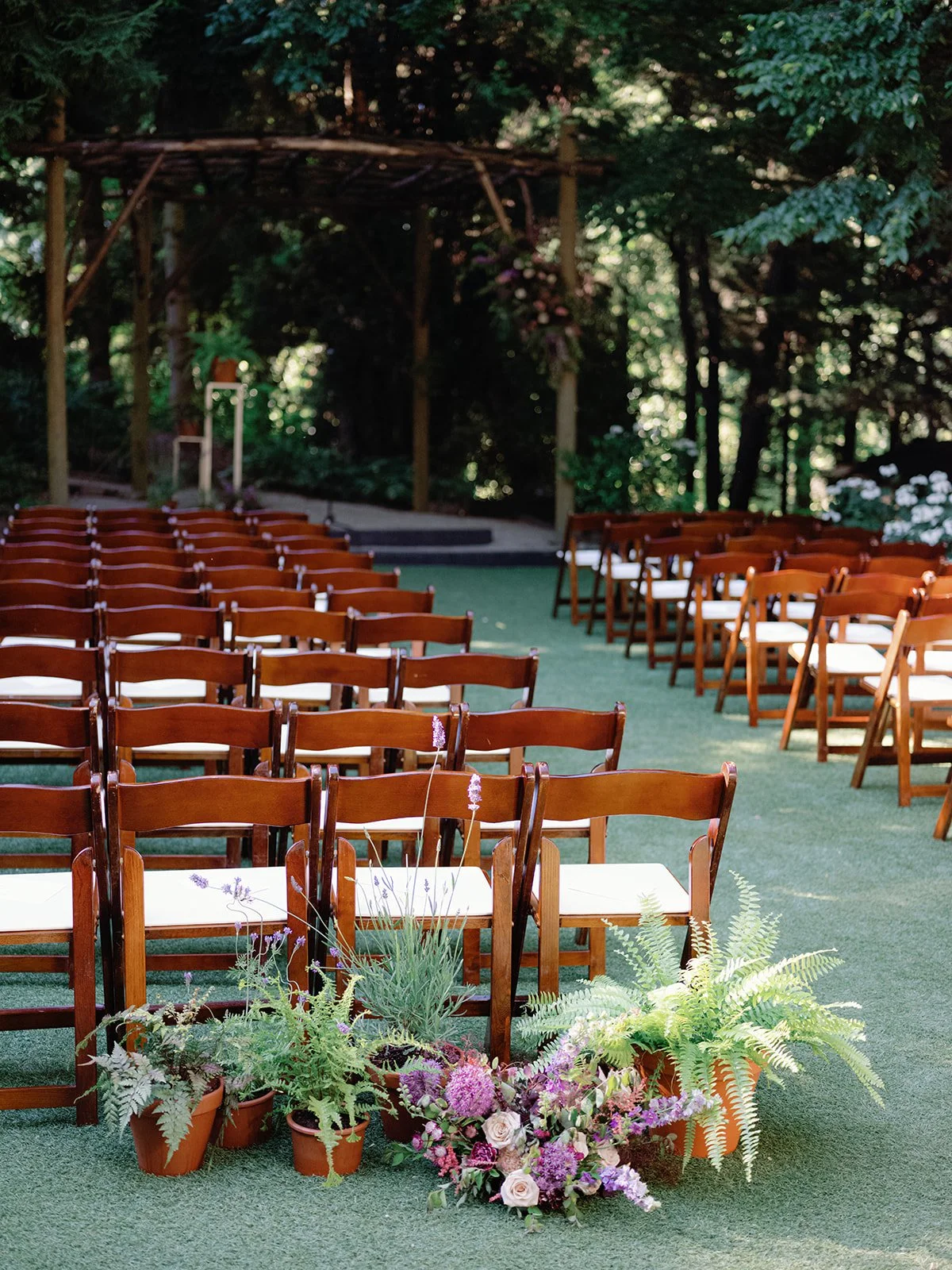 On a mild late April day, tucked on the wooded hill at JM Cellars in Woodinville, a sweet couple was getting ready to say I do. We added white flowers to the already beautiful ceremony spot.